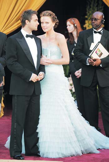 上屆影后查理茲·塞隆的著裝,遠(yuǎn)比去年她拿獎(jiǎng)時(shí)的那身出彩,淡青色的雪紡料長裙,既貼身又下垂,正好將她曼妙的身材凸顯得玲瓏有致;低胸的設(shè)計(jì),再配上同色的薄紗做點(diǎn)綴,顯得明快生動(dòng);裙的下部是層層擴(kuò)大的荷邊式下擺,裙尾略有拖地,恰到好處地彌補(bǔ)了塞隆腰短的缺點(diǎn),空靈飄逸,幽雅高貴,整體效果非常出眾。