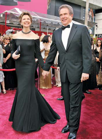 高貴的黑色禮服對安妮特·貝寧與沃倫·比蒂這對中年夫婦來說,是再適合不過了。二人的身材都保持得不錯(cuò),尤其是貝寧,雖然身高不出眾,肚腩也是日漸明顯,不過她的這身魚尾收腰禮服,很好地掩蓋了這些缺點(diǎn)。另外,露肩的設(shè)計(jì),本來會(huì)凸顯出貝寧衰老的脖子,不過,她添加了一件黑色的圓珠形頸鏈,很好地彌補(bǔ)了這一不足;沃倫高大挺拔的身材很襯黑色的西裝,所以這對夫妻的著裝,非常成功。