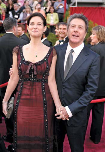 達(dá)斯丁·霍夫曼夫婦的衣著也是可圈可點(diǎn)的。太太麗莎一套低胸紅色的長裙禮服大方得體,如果說安妮特·貝寧的黑色禮服體現(xiàn)的是高貴優(yōu)雅,那麗莎的這一身則是生動(dòng)性感。裙外還配了黑色軟紗,亮銀色的裝飾點(diǎn)綴于裙身和裙擺,顯得明朗而輕快。霍夫曼的筆挺西裝與太太裙子的風(fēng)格搭配得很協(xié)調(diào)。