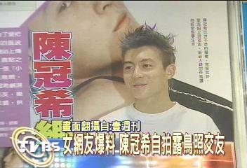 據(jù)TVBS消息,該周刊根據(jù)女網(wǎng)友的爆料,刊登疑似陳冠希的露點(diǎn)照,3張照片中,有2張露臉,第一張是陳冠希面對(duì)鏡頭自拍,眼神慵懶的露出招牌笑容,狂電女網(wǎng)友。