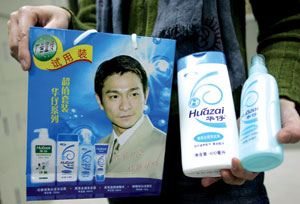 記者見到,在“華仔系列”超級套裝的宣傳紙袋以及該公司出品的“黑亮去屑洗發(fā)露”的包裝盒以及宣傳單上,印有劉德華面帶微笑、穿著米黃西裝的半身像。據(jù)調(diào)查,印有劉德華形象的各類洗滌化妝用品的出廠價格低得驚人。一罐1130毫升沐浴露出廠價僅為3.5元,而在市場上卻達(dá)35元以上。