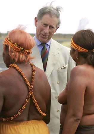 3月2日,查爾斯前往澳大利亞內(nèi)地進(jìn)行訪問。王儲一抵達(dá)愛利斯泉,就由赤裸著上身的土著婦女熱情迎接,王儲看得兩眼不知該往哪里瞧才好。土著人又給他端上一桌蟲蟲大餐,更讓王儲吃不消。