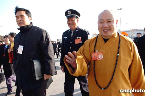十屆全國(guó)人大三次會(huì)議三月四日在北京人民大會(huì)堂舉行預(yù)備會(huì),廣東代表團(tuán)的釋明生代表(右)出席會(huì)議。作者:陳文