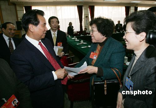中共中央政治局常委、中紀(jì)委書記吳官正三月四日看望參加全國政協(xié)十屆三次會議的共青團(tuán)、青聯(lián)、婦聯(lián)界委員,并參加聯(lián)組會討論。作者:毛建軍