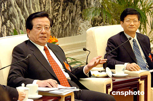 中共中央政治局常委、國家副主席曾慶紅三月五日到全國人大江西團(tuán)與代表們一起審議溫家寶總理所作政府工作報(bào)告。 作者:陳文