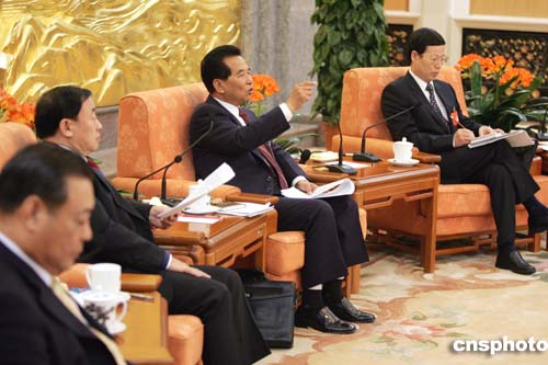 三月六日,中共中央政治局常委吳官正在北京人民大會堂與出席十屆全國人大三次會議的山東代表一起審議政府工作報告。作者:毛建軍