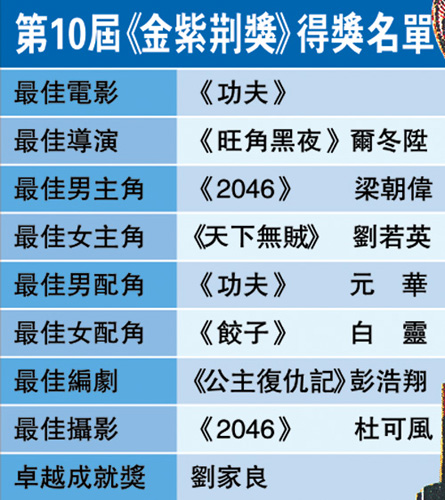 獲得本屆“金紫荊獎”十大華語片獎的影片是:《旺角黑夜》、《新警察故事》、《天下無賊》、《203040》、《2046》、《功夫》、《十面埋伏》、《大事件》、《公主復(fù)仇記》、《餃子》。