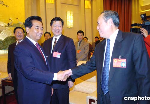 中共中央政治局常委吳官正三月七日到全國(guó)人大黑龍江代表團(tuán)與代表們一起審議溫家寶總理所作的政府工作報(bào)告。作者:陳文