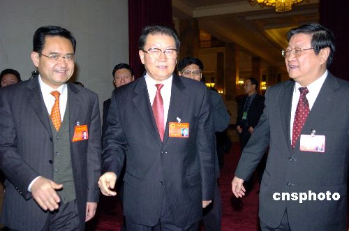 中共中央政治局常委李長(zhǎng)春三月八日到全國(guó)人大河北代表團(tuán),與代表們一起審議《反分裂國(guó)家法(草案)》。圖為李長(zhǎng)春與河北省委書(shū)記白克明(右)等交談。作者:陳文