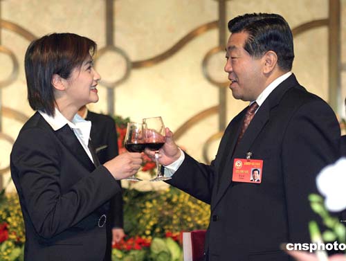 全國政協(xié)辦公廳、中央統(tǒng)戰(zhàn)部三月九日在北京釣魚臺國賓館舉行港澳地區(qū)政協(xié)委員招待會。香港嘉賓吳小莉向全國政協(xié)主席賈慶林祝酒。作者:王辛莉