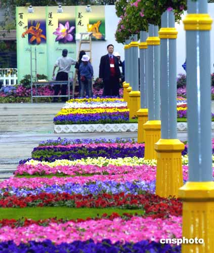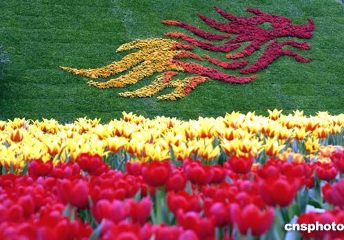 進入花卉展,最當眼的是一只大約十米高的大公雞,它不時發(fā)出“喔、喔、喔”的啼叫聲。原來,這是只由上萬朵花卉精心扎成錦雞。與它遙相呼應的,是一對飛舞的火鳳凰,也是由鮮花扎制。主辦方希望以此為復蘇的香港報曉,祝愿香港騰飛。
