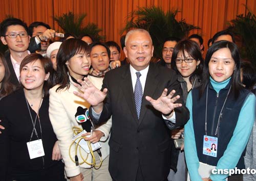 全國政協(xié)十屆三次會議三月十二日下午閉幕后,新當選的全國政協(xié)副主席董建華在北京政協(xié)禮堂舉行新聞發(fā)布會,并與現(xiàn)場采訪的香港記者們合影。作者:毛建軍