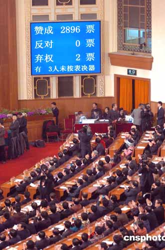 反分裂國家法以2896票贊成0票反對獲表決通過