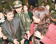 中新網(wǎng)3月17日電 據(jù)香港《大公報(bào)》報(bào)道,二○○五年度中國(guó)十佳勞倫斯冠軍頒獎(jiǎng)典禮昨晚在深圳舉行,出席運(yùn)動(dòng)員有劉翔、田亮等,頒獎(jiǎng)嘉賓則有劉嘉玲、成龍、郭富城等,運(yùn)動(dòng)員與明星互相輝映,星光熠熠,在場(chǎng)夾道歡迎的Fans為之瘋狂。當(dāng)中又以田亮表現(xiàn)最為親切,他主動(dòng)走向前同F(xiàn)ans“giveme five”,令Fans們樂(lè)開(kāi)懷?磥(lái)田亮未有受與吳敏霞緋聞?dòng)绊憽?object align="left" classid="clsid:D27CDB6E-AE6D-11cf-96B8-444553540000" codebase="http:///pub/shockwave/cabs/flash/swflash.cab#version=5,0,0,0" height="250" width="350">