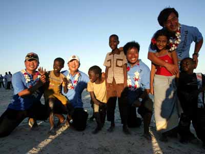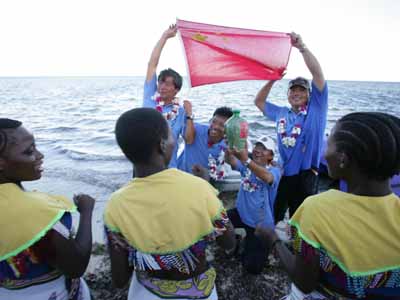 當地時間十九日晚,肯尼亞的專業(yè)合唱團體以及少兒演員載歌載舞歡聚一堂,在蒙巴薩白沙海灘,以獨特的非洲風情歌舞,盛迎抵達蒙巴薩的“鳳凰號”,以及前來迎接鳳凰號的中國客人?夏醽喓铣獔F用中文演唱的中國民歌《在那遙遠的地方》博得全場熱烈掌聲。美麗的“二OO四肯尼亞小姐”朱麗葉、在肯留華校友會主席哪吒先生,與鳳凰衛(wèi)視主持人竇文濤和陳魯豫共同主持了晚會。完