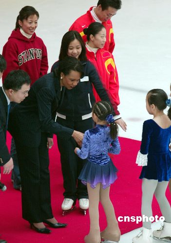 美國國務(wù)卿賴斯三月二十一日在北京與中國花樣滑冰愛好者親切交流,中國著名雙人滑選手申雪、趙宏博、冬季奧運(yùn)會金牌選手楊陽等陪同出席活動。作者:滿會喬
