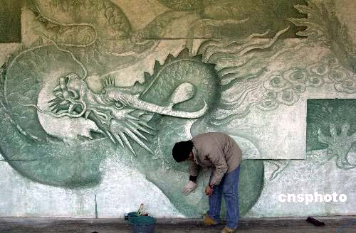日本愛知世博會開幕在即,中國館已經(jīng)整備完畢靜候開展。圖為有關(guān)工作人員精心擦拭九龍紋外墻。作者:王健
