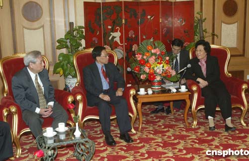 三月二十三日,中國國務(wù)院僑辦主任陳玉杰在北京世紀(jì)飯店會見吳顯揚(中)、關(guān)其煉(左一)團(tuán)長率領(lǐng)的芝加哥中華會館訪華團(tuán)。作者:史利