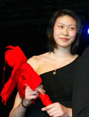 一襲黑色長裙,露出半邊肩膀,是好萊塢剛流行過的式樣。趙蕊蕊顯然是無法習(xí)慣這樣性感的裝束,羞答答地上了臺。直到迎上帥哥索普贊許的眼神,更是露出一臉羞澀的笑容。“還真不習(xí)慣這樣穿,別扭極了!闭f話聲音一如平時的爽朗,“還是運(yùn)動衣更符合我的氣質(zhì)。”這樣的曳地長裙,還會再穿么?“也許不會了吧。”