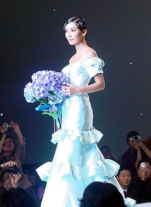 中新網(wǎng)3月24日電 據(jù)新聞晚報報道,昨天(23日)下午,在世貿(mào)商城的韓國時裝紡織博覽會上,韓國明星金素妍、鄭俊鎬身穿韓國頂級時裝大師AndreKim(安德烈·金)設(shè)計的最新服裝舉行了一場別開生面的婚紗秀,贏得了中國影迷的熱烈歡呼。下午三點,婚紗秀現(xiàn)場正式開放,爭相涌進(jìn)的觀眾讓表演現(xiàn)場一時陷入癱瘓。主辦方不得不現(xiàn)場趕人,沒有邀請函的觀眾一律“清理”。當(dāng)金素妍和鄭俊鎬雙雙出現(xiàn)在舞臺上時,歡呼聲伴隨著閃光燈爆發(fā)出來,出現(xiàn)了仿佛是搖滾樂演唱會的情景。特別是當(dāng)鄭俊鎬輕吻金素妍前額時,一些女影迷當(dāng)場流出了熱淚。