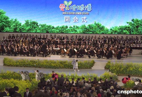 隨著日本皇太子德仁按下世博會啟動按鈕,會場中飄起了畫著眼睛的紙片,愛知世博會在“讓我們心連心”的歌曲大合唱中正式開始。開幕式慶典即進(jìn)入第二部分,由近百名世界知名音樂家組成的“世博超級全球管弦樂團(tuán)”為觀眾演奏了霍爾斯特的《行星》組曲之《木星》;肖邦的《夜曲》和斯特拉文斯基的《火鳥》。
