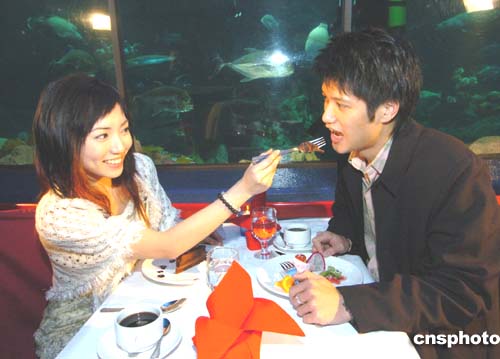 香港海洋公園復(fù)活節(jié)期間在海洋館推出“海底晚宴”﹐在品嘗美食的同時(shí)可欣賞到各種迷人的海洋生物在餐桌旁邊往來游動(dòng)﹐別有一番風(fēng)趣。作者:趙振清