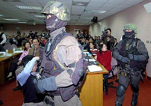 中新網(wǎng)3月30日電 為了說明反恐現(xiàn)況,臺“立法院國防委員會”特地找了全副武裝的軍警特種部隊人員到現(xiàn)場解說。帶槍進“立法院”實在敏感,讓不少“立委”瞠目結舌。