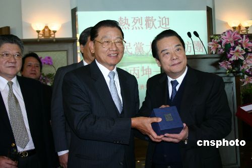| 中國國民黨副主席江丙坤一行三十日中午在南京會見江蘇臺商。他表示,臺商在江蘇得到最好的照顧,他們的事業(yè)大部分都相當(dāng)?shù)某晒ΑE_商在這里的發(fā)展對大陸的經(jīng)濟(jì)發(fā)展也有相當(dāng)大的貢獻(xiàn)。但是,兩岸人民不但祈求經(jīng)濟(jì)的繁榮,更希望兩岸的和平,因?yàn)閮砂兜暮推讲拍軒韮砂兜姆睒s。圖為江丙坤向江蘇臺商贈送禮品。作者:陳旻
