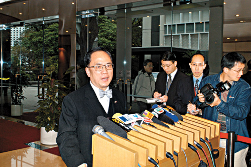 曾蔭權(quán)、律政司司長(zhǎng)梁愛(ài)詩(shī)、政制事務(wù)局局長(zhǎng)林瑞麟昨日開(kāi)始分批會(huì)見(jiàn)立法會(huì)議員,昨日更率先與民建聯(lián)及民主黨的立法會(huì)議員會(huì)面。曾蔭權(quán)表示,會(huì)面的主要目的是希望探討所有實(shí)際而可行的方法,盡量確保在七月十日舉行的行政長(zhǎng)官選舉可以順利進(jìn)行。他說(shuō):“現(xiàn)時(shí)香港市民普遍都有一個(gè)期望,希望我們?cè)谄咴率漳軌蝽樌a(chǎn)生一位行政長(zhǎng)官,能夠掃除所有因?yàn)樾姓L(zhǎng)官出缺而可能受影響的政府運(yùn)作,以及社會(huì)活動(dòng),和一切不明朗的因素,特區(qū)政府與立法會(huì)議員也有同樣的責(zé)任去照顧所有市民的顧慮!