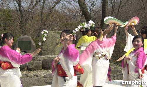 | 日本創(chuàng)價(jià)大學(xué)校園內(nèi)三日舉行傳統(tǒng)的“周櫻”觀賞會(huì)。三十年前,在創(chuàng)價(jià)學(xué)會(huì)會(huì)長池田大作的提議下,首批留學(xué)創(chuàng)價(jià)大學(xué)的六名中國留學(xué)生種植櫻花樹苗,被命名為“周櫻”。此后,每年春暖花開時(shí)節(jié)的“周櫻”觀賞會(huì),便成為此間日本友人緬懷周恩來的一項(xiàng)傳統(tǒng)活動(dòng)。圖為在“周櫻”紀(jì)念碑前,創(chuàng)價(jià)大學(xué)學(xué)生手持櫻花翩翩起舞。作者:王健