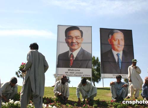 為了迎接中國總理溫家寶對巴基斯坦的正式訪問,巴方在總統(tǒng)府前的迎賓大道兩側樹立起兩國領導人的巨幅畫像。伊斯蘭堡市政局員工阿亞杰馬說,為了表達對中國客人的歡迎和尊敬,“我們希望用我們所能想出的最熱烈的方式歡迎溫家寶總理”。作者:齊彬
