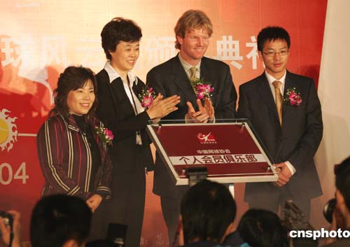 | 四月八日在北京舉行的“第三極中國網(wǎng)球峰會暨網(wǎng)球風(fēng)云榜頒獎典禮”上,來自美國的網(wǎng)球“四大天王”之一考瑞爾(右二)、中國著名運(yùn)動員鄧亞萍、中國網(wǎng)球協(xié)會副主席孫晉芳、中關(guān)村文化發(fā)展股份有限公司、第三極總裁歐陽旭(右一)等為中國網(wǎng)協(xié)個人會員的第一個基地揭牌。作者:武仲林