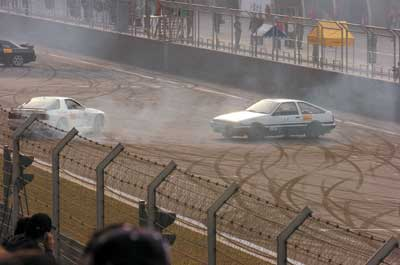 幾萬(wàn)名觀眾觀看了《頭文字D》電影中的飄移比賽,在電影中使用的四輛賽車(chē)AE86、EVO、FC、GTR專(zhuān)門(mén)從香港運(yùn)送過(guò)來(lái),四輛賽車(chē)在跑道中呼嘯著做各種轉(zhuǎn)彎和飄移的動(dòng)作,隨著一道道青煙的升起,全場(chǎng)立即沸騰起來(lái)。