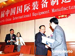 四月十二日,第四屆中國國際裝備制造業(yè)博覽會在北京人民大會堂舉行新聞發(fā)布會,中國商務(wù)部副部長魏建國(右二)、遼寧省副省長李萬才(右一)分別介紹中國機(jī)電產(chǎn)品進(jìn)出口和展覽會籌備情況。第四屆中國國際裝備制造業(yè)博覽會將于八月三十日在沈陽舉行。作者:王麗南