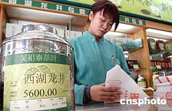 最新上市每斤售價(jià)五千六百元人民幣的精品西湖龍井茶葉在北京旺銷,價(jià)格雖是去年的二點(diǎn)五倍,首批貨卻已被搶購(gòu)一空。據(jù)了解,由于去冬今春天氣格外陰冷,加上“倒春寒”、降雪等因素,杭州今年清明前茶的上市比以往推遲數(shù)日,西湖龍井的產(chǎn)量大幅減少,收購(gòu)價(jià)格有所上漲。作者:徐曦弋