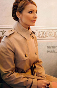 從雜志社提前披露的一些插圖來看,拍攝地點應(yīng)是季莫申科總理在政府大樓內(nèi)的休息室,家具比較大氣,也顯得有些笨重,具有典型的蘇聯(lián)官員風(fēng)格,顯然,已有不止一屆的政府總理使用過。季莫申科不僅穿著西裝,還戴有披風(fēng)。
