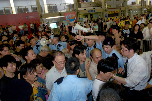 昨上午十時(shí)四十五分已有數(shù)百名馬迷輪候換取,至十一時(shí)零五分,懷疑有十多名馬迷不守秩序,插隊(duì)搶帽引起混亂,雖然在場警員架起“鐵馬”控制場面。其后,人群再爭相索取,甚至推翻鐵欄,多人跌倒受傷,場面失控。現(xiàn)場所見,部分用作分隔人群的鐵欄被壓至變形。