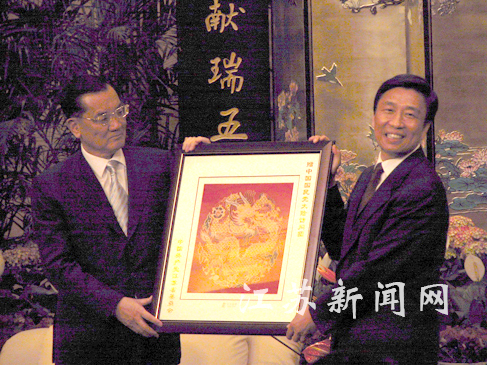 李源潮向連戰(zhàn)贈(zèng)送了禮品,是一副南京特產(chǎn)云錦織出的金絲團(tuán)龍。李源潮說:龍是中華民族的象征。連戰(zhàn)向江蘇省回贈(zèng)了禮品,是臺(tái)灣的三羊開泰瓷瓶,連戰(zhàn)說:以此祝愿江蘇發(fā)展、興旺。