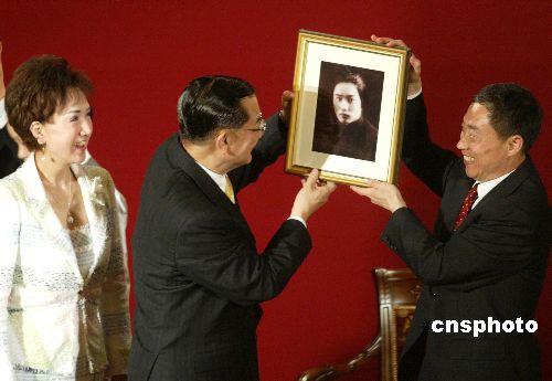 中新網(wǎng)4月29日電 中國國民黨主席連戰(zhàn)在北大演講結(jié)束后,北京大學(xué)校務(wù)委員會(huì)教授李云放教授向連戰(zhàn)贈(zèng)送兩件具有特殊意義的北京大學(xué)的紀(jì)念品。連戰(zhàn)并向北京大學(xué)回贈(zèng)了禮物。