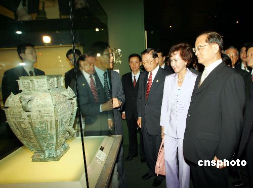 連戰(zhàn)夫人連方瑀女士則是對博物館中古代青銅館的展示更感興趣。她在這里觀賞時(shí),饒有興致地向副館長追問數(shù)件青銅器的來頭和名目。關(guān)于為什么有青銅器是黃顏色的?館方人士解釋,那是剛出土的青銅器,它們未充分氧化時(shí)并不呈現(xiàn)為綠色。一行人恍然大悟,青銅器并不是從來呈現(xiàn)為綠色。