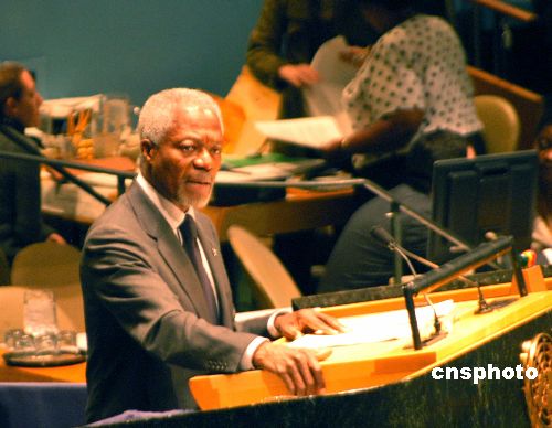 當(dāng)?shù)貢r(shí)間五月二日,《不擴(kuò)散核武器條約》二○○五年審議大會(huì)在紐約聯(lián)合國(guó)總部召開,聯(lián)合國(guó)秘書長(zhǎng)安南到會(huì)致詞。作者:譚宏偉