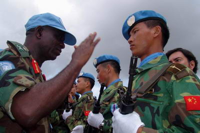 中新網5月6日電 據外交部網站消息,5月5日,中國人民解放軍第二批駐利比里亞維和部隊授勛儀式在利首都蒙羅維亞隆重舉行,聯合國利比里亞特派團(簡稱聯利團)代理行政長官穆薩大使、武裝部隊總司令奧瓦尼比中將和副總司令塔希爾少將、行政總監(jiān)斯托克斯等聯利團高級官員,中國駐利大使林松添等使館主要外交官,各國駐利維和部隊司令、軍事和民事觀察員及民事警察代表等近500人出席儀式。中國維和部隊領隊唐倫興上校、林松添大使和穆薩大使分別致辭。穆薩大使代表聯利團檢閱了中國維和部隊儀仗隊,并同聯利團主要官員向中國維和官兵頒發(fā)聯合國維和勛章。