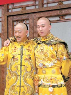 《飛龍倚天游》和《龍非龍鳳非鳳》兩部古裝戲昨天在橫店同時(shí)對(duì)媒體開放。雖然是兩個(gè)各自獨(dú)立的劇組,但兩部戲方方面面千絲萬縷的聯(lián)系起初仍搞得記者們一頭霧水。首先,兩部戲都是亦莊亦諧風(fēng)格的情節(jié)劇,故事又都發(fā)生在清朝,而且除了張國立父子同上陣外,鄧婕還在《龍非龍鳳非鳳》中扮演慈禧并擔(dān)任總制片人。更復(fù)雜的是張國立及張默、王剛、臺(tái)灣演員鄭家榆等又在兩部戲中分別出演不同角色,搞得兩部戲之間的聯(lián)系更為復(fù)雜。