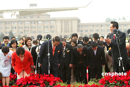 五月十三日上午,親民黨主席宋楚瑜結(jié)束了九天八夜的大陸之行離開北京,在發(fā)表臨行感言后帶領(lǐng)全體親民黨大陸訪問團(tuán)團(tuán)員鞠躬致謝。作者:廖文靜