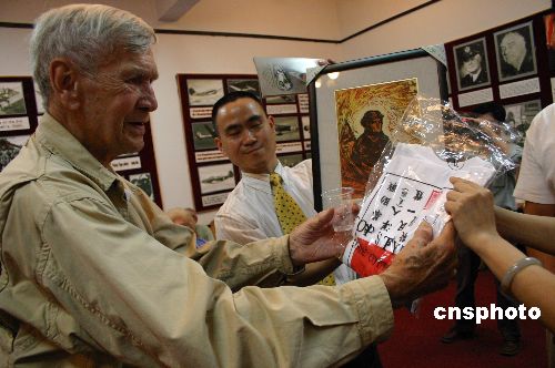 飛虎隊展覽館工作人員向愛德華·康姆亞蒂(左)贈送陳納德將軍畫像和二戰(zhàn)期間美國飛行員必備的印有“來華助戰(zhàn)洋人(美國)軍民一體救護(hù)”的“救命服”
