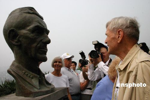 史迪威將軍舊居大門內(nèi),愛德華·康姆亞蒂(右一)在史迪威將軍雕像前緬懷曾經(jīng)的烽火歲月