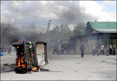 在另一個(gè)邊境城鎮(zhèn)Korasu,街道上遍布警車燒焦后的殘骸,以及從已被焚毀的政府辦公室里灑出的文件。