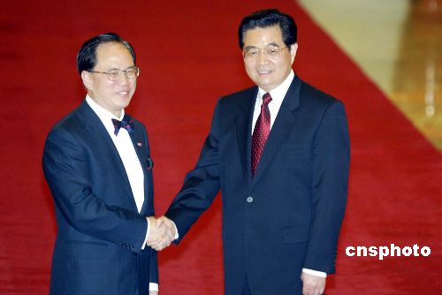 五月十六日晚,二○○五北京《財(cái)富》全球論壇在北京人民大會(huì)堂開幕。中國國家主席胡錦濤在開幕式前會(huì)見參會(huì)的VIP嘉賓。圖為會(huì)見時(shí)胡錦濤與香港署理行政長官曾蔭權(quán)握手。作者:廖文靜