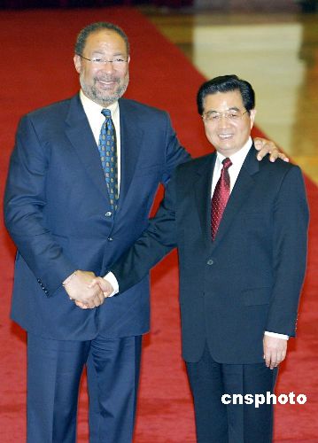 五月十六日晚,二○○五北京《財富》全球論壇在北京人民大會堂開幕。中國國家主席胡錦濤在開幕式前會見參會的VIP嘉賓,圖為與時代華納公司董事長理查德·帕森里握手。作者:廖文靜