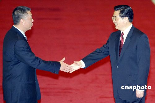 五月十六日晚,二○○五北京《財(cái)富》全球論壇在北京人民大會(huì)堂開(kāi)幕。中國(guó)國(guó)家主席胡錦濤在開(kāi)幕式前會(huì)見(jiàn)參會(huì)的VIP嘉賓。圖為會(huì)見(jiàn)時(shí)胡錦濤與澳門(mén)特區(qū)行政長(zhǎng)官何厚鏵握手。作者:廖文靜